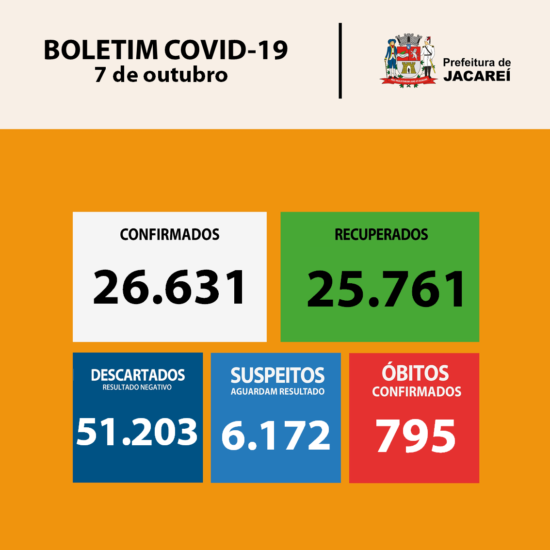 Jacareí está com 26.631 casos confirmados da doença. São 13.721 mulheres e 12.910 homens. Dos confirmados, estão internados cinco (cinco em hospital público – sendo três em UTI –, e nenhum em hospital privado). Há 75 confirmados em isolamento (internados e em casa). E 795 óbitos até aqui.
