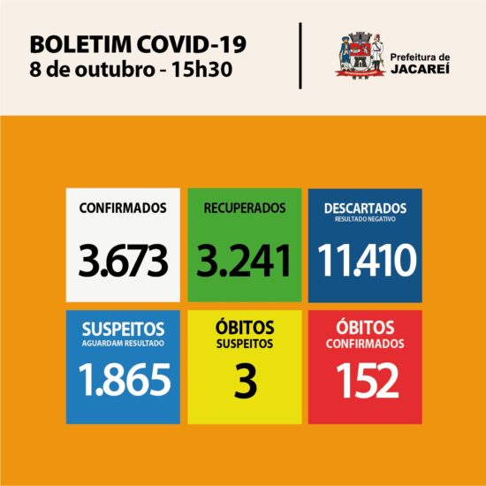 A Secretaria Municipal de Saúde de Jacareí informa, nesta quinta-feira (8), mais três óbitos por COVID-19 no município. Trata-se de duas mulheres e um homem. O primeiro caso, de uma mulher de 88 anos, ocorreu no dia 5 de outubro, em unidade pública de saúde. Ela tinha comorbidades. O segundo foi de uma mulher de 78 anos, com comorbidades, que faleceu no dia 6 de outubro, também em unidade pública de saúde. O terceiro óbito foi de um homem de 67 anos, que não tinha comorbidades e faleceu em unidade particular de saúde.