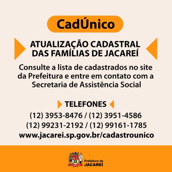 A Prefeitura de Jacareí, por meio da Secretaria de Assistência Social, convoca as famílias cadastradas no CadÚnico, e que estão na lista, para realizarem a atualização cadastral. A medida é necessária para que as famílias continuem recebendo benefícios sociais do Governo Federal.