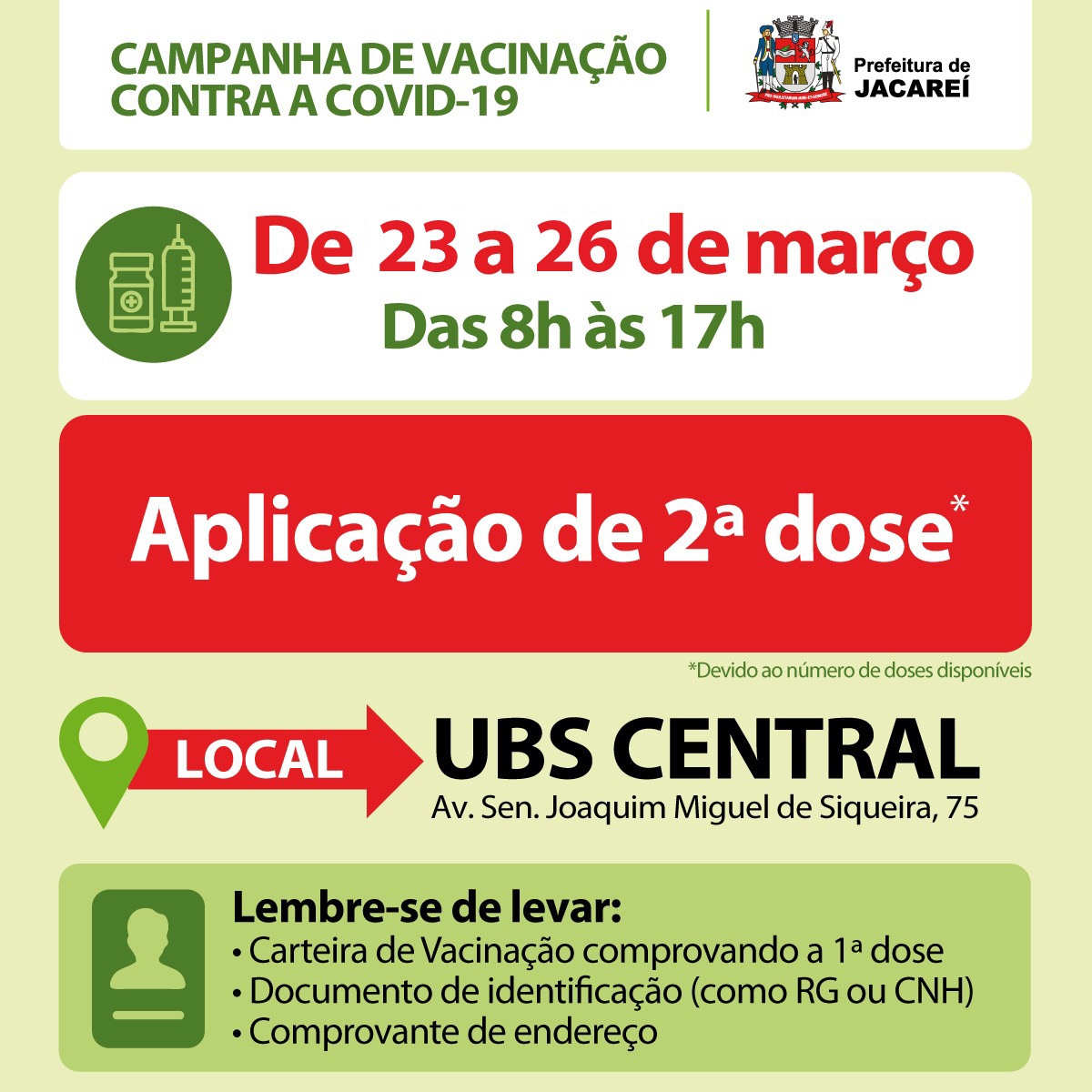A Prefeitura de Jacareí, por meio da Secretaria de Saúde, irá aplicar somente a segunda dose da vacina contra a Covid-19 entre terça (23) e sexta-feira (26). A cidade aguarda a chegada de um novo lote do imunizante para dar sequência à Campanha de Vacinação.