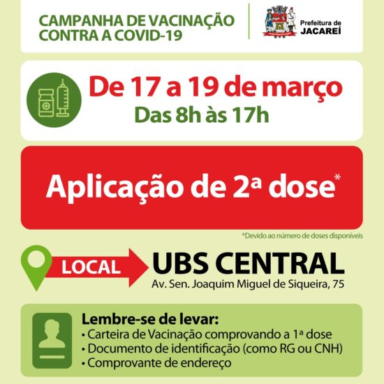 A Prefeitura de Jacareí, por meio da Secretaria de Saúde, irá aplicar somente a segunda dose da vacina contra a Covid-19 entre quarta (17) e sexta-feira (19). A cidade aguarda a chegada de um novo lote do imunizante para dar sequência à Campanha de Vacinação.