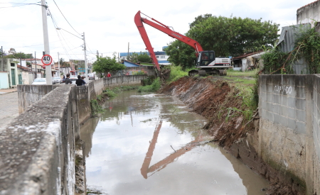 Legenda: Equipamentos estão trabalhando na limpeza preventiva do Córrego do Turi, na região central de Jacareí