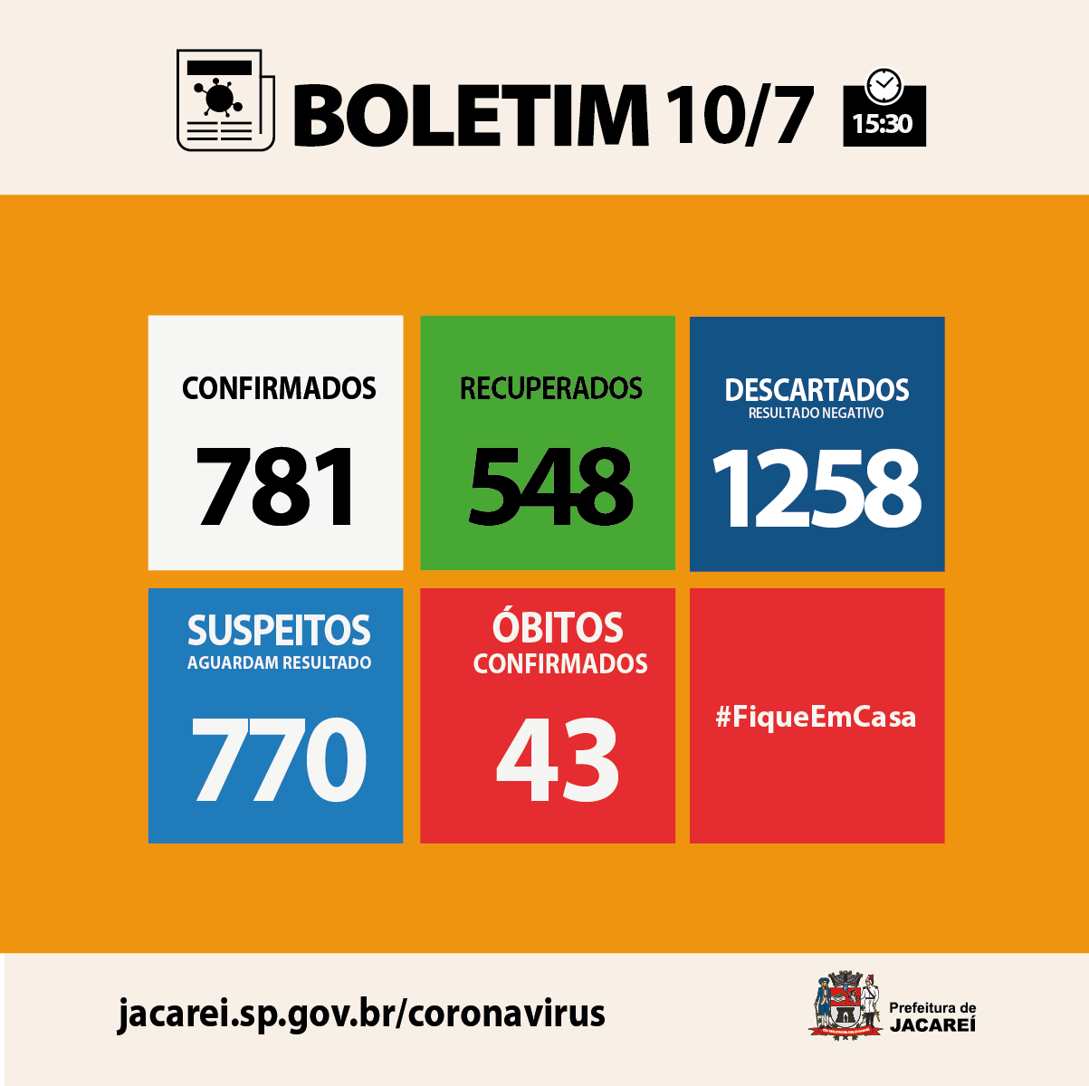 Combate ao Coronavírus em Jacareí – 10 de julho – 781 casos confirmados; 548 recuperados
