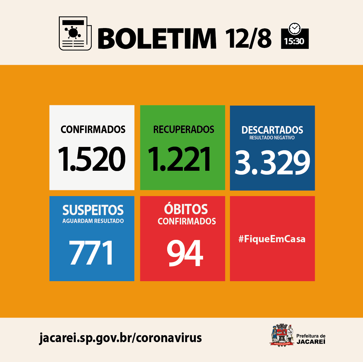 Jacareí chegou a 1520 casos confirmados da doença. São 781 homens e 739 mulheres. Dos confirmados, estão internados 34 (14 em hospital público – sendo três em UTI –, e 20 em hospital privado – sendo sete em UTI). Há 171 em isolamento domiciliar. E 94 óbitos, até aqui.