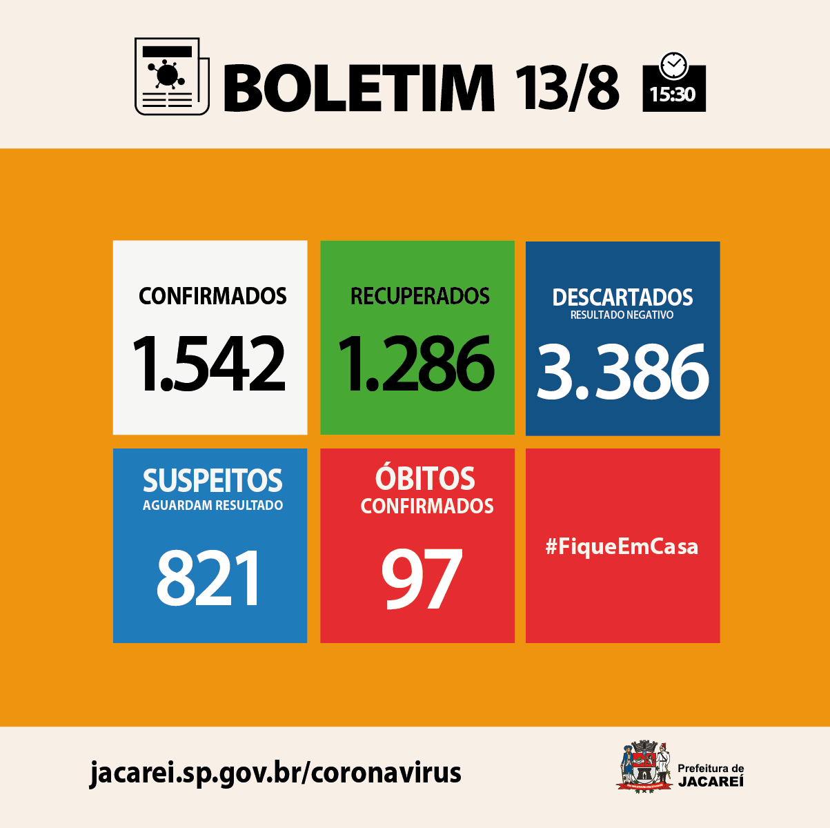 Jacareí chegou a 1542 casos confirmados da doença. São 795 homens e 747 mulheres. Dos confirmados, estão internados 36 (14 em hospital público – sendo três em UTI –, e 22 em hospital privado – sendo sete em UTI). Há 123 em isolamento domiciliar. E 97 óbitos, até aqui.