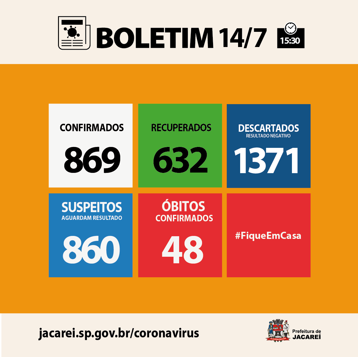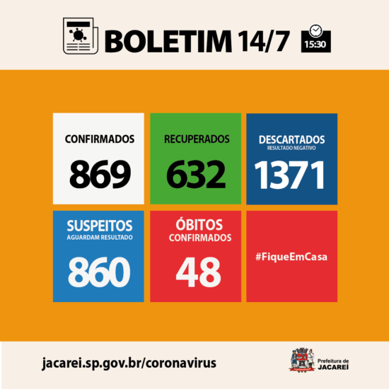 Combate ao Coronavírus em Jacareí – 14 de julho – 48 óbitos; 869 casos confirmados; 632 recuperados