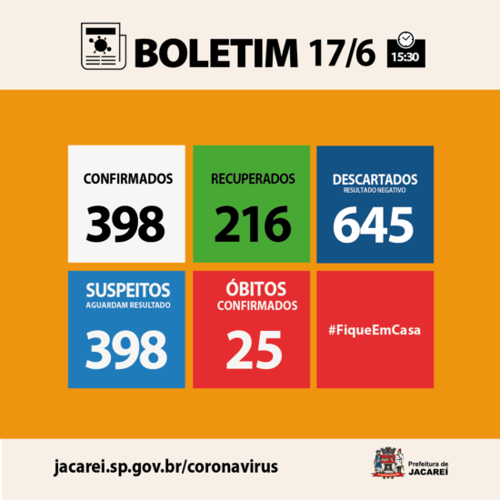 Nesta quarta-feira (17), a Prefeitura de Jacareí informa o 25º óbito confirmado por COVID-19 no município. Trata-se de uma mulher de 41 anos, que faleceu no dia 8 de junho em hospital público. Ela tinha hipertensão. (INFORMAÇÃO RETIFICADA NO BOLETIM DO DIA 18 DE JUNHO)