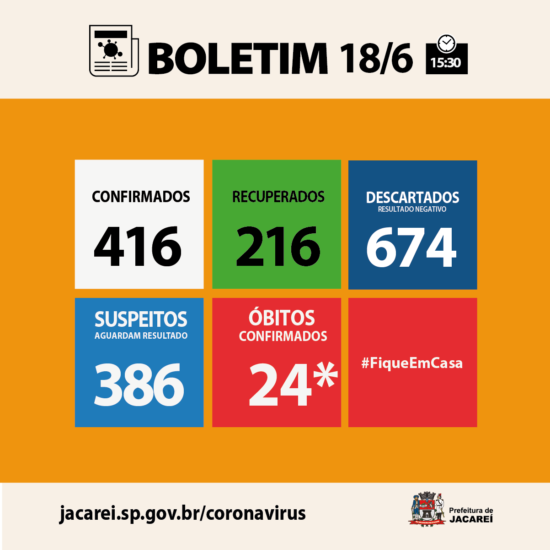 Nesta quinta-feira (18), a Prefeitura de Jacareí informa que aumentou para 416 o número de casos confirmados de COVID-19 no município (eram 398 na quarta-feira). São 229 homens e 187 mulheres. Estão internados 19 (sete em hospital público – nenhum em UTI –, e 12 em hospital privado – sendo quatro em UTI). Há 157 em isolamento domiciliar.
