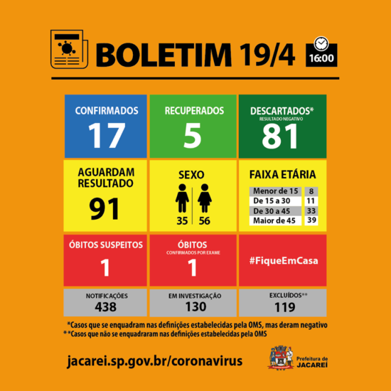 Combate ao Coronavírus em Jacareí – 19 de abril – 17 confirmações e 81 casos descartados