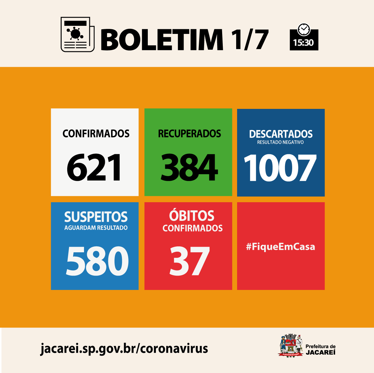 Jacareí chegou a 621 casos confirmados da doença (eram 602 na terça-feira). São 339 homens e 282 mulheres. Dos confirmados, estão internados 27 (11 em hospital público – nenhum em UTI –, e 16 em hospital privado – sendo oito em UTI). Há 173 em isolamento domiciliar. E 37 óbitos, até aqui.