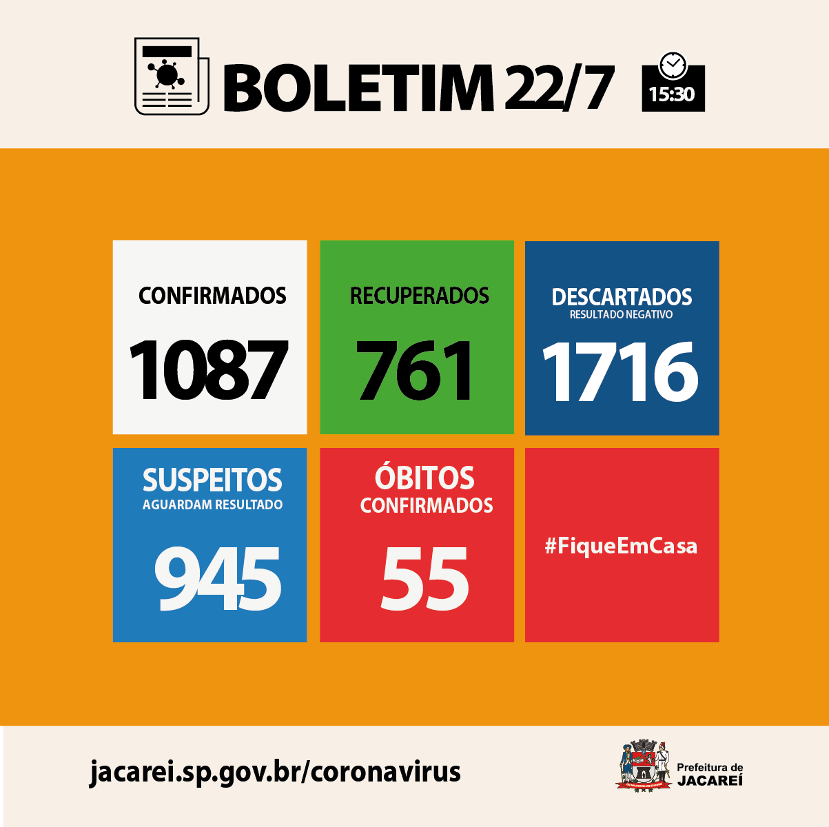 Nesta quarta-feira (22), a Prefeitura de Jacareí informa que chegou a 1087 casos confirmados de COVID-19 no município (eram 1054 na terça-feira). São 570 homens e 517 mulheres. Dos confirmados, estão internados 36 (13 em hospital público – sendo dois em UTI –, e 23 em hospital privado – sendo 13 em UTI). Há 235 em isolamento domiciliar. E 55 óbitos, até aqui.
