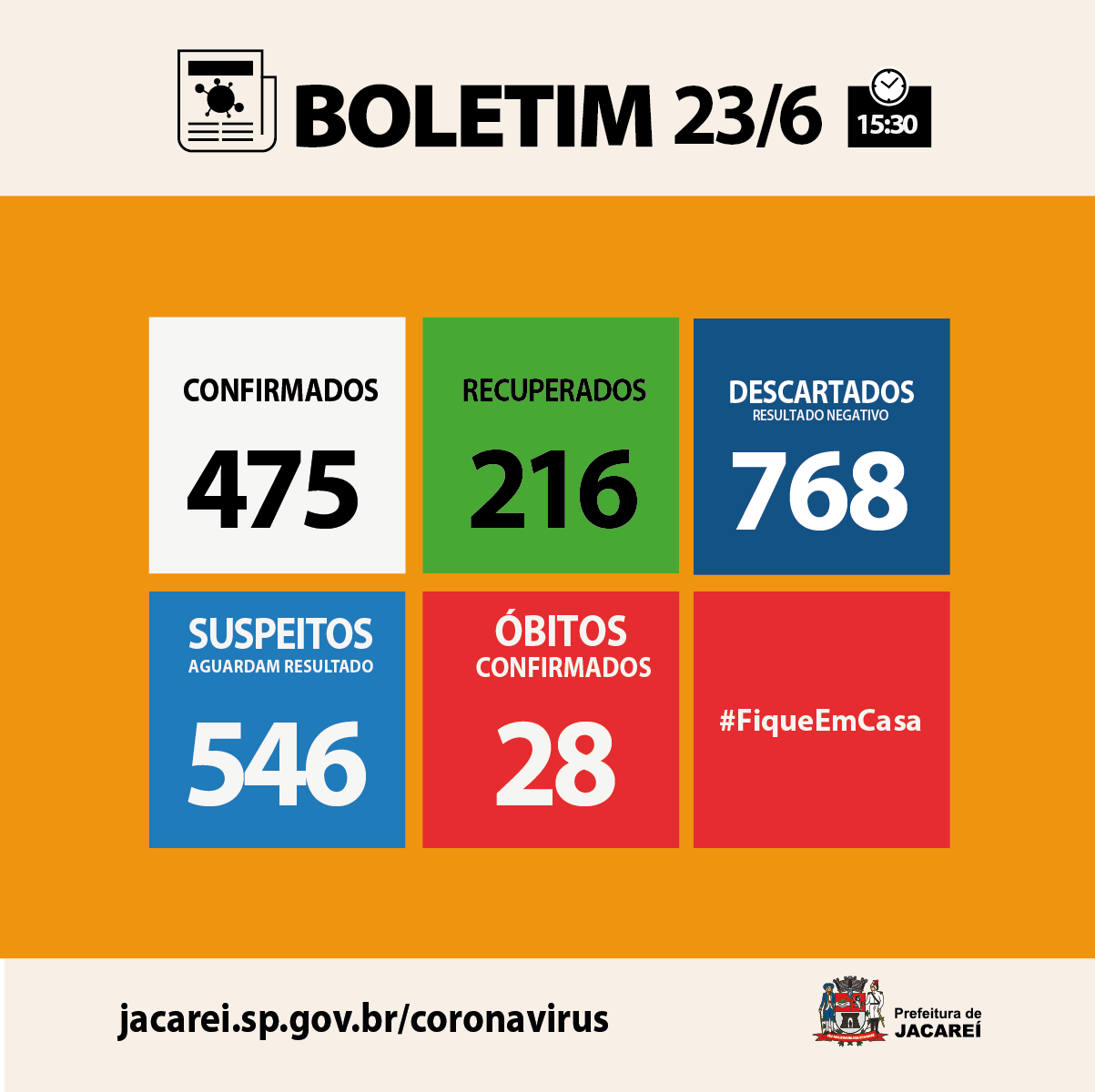 A Prefeitura de Jacareí informa, nesta terça-feira (23), que foi para 475 casos confirmados de COVID-19 no município (eram 464 na segunda-feira). São 262 homens e 213 mulheres. Dos confirmados, estão internados 20 (seis em hospital público – nenhum em UTI –, e 14 em hospital privado – sendo cinco em UTI). Há 211 em isolamento domiciliar. E 28 óbitos, até aqui.