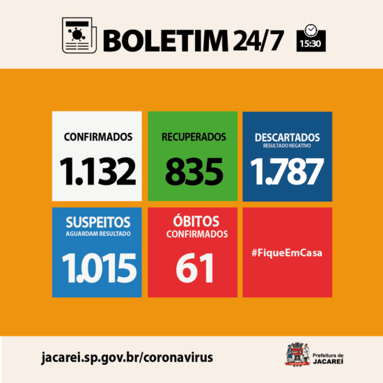 Nesta sexta-feira (24), a Prefeitura de Jacareí informa mais dois óbitos por COVID-19 no município (um homem e uma mulher). O homem tinha 56 anos e faleceu no início de julho, em unidade pública de saúde. Ele não tinha comorbidades. A mulher, de 79 anos, faleceu nesta semana, também em unidade pública de saúde, e tinha comorbidades.