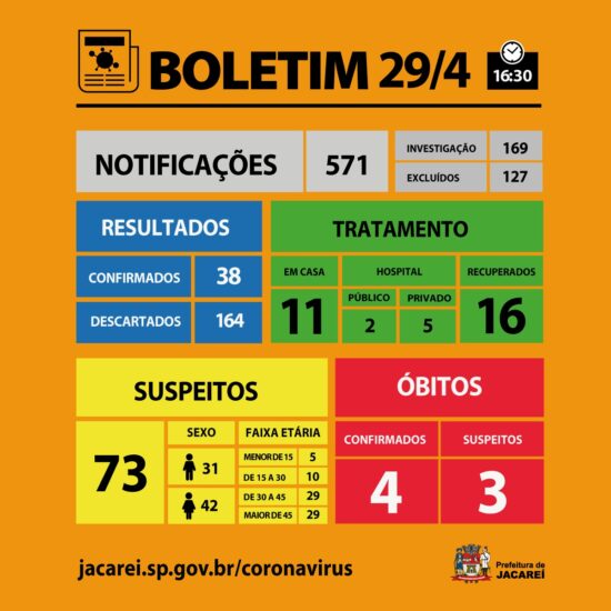 ÓBITOS – Jacareí permanece com quatro óbitos confirmados. Dois deles foram divulgados na sexta-feira (24), e os detalhes estão aqui. Os outros óbitos, anunciados anteriormente, foram confirmados no dia 3 abril e no dia 22 de abril.