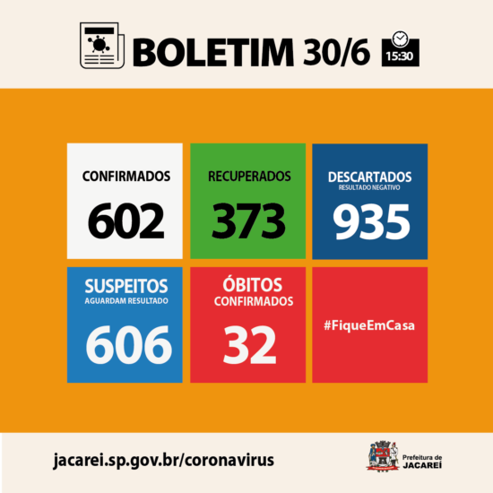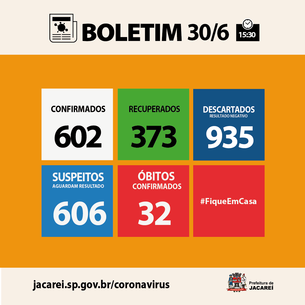 Jacareí chegou a 602 casos confirmados da doença (eram 578 na segunda-feira). São 328 homens e 274 mulheres. Dos confirmados, estão internados 23 (cinco em hospital público – sendo um em UTI –, e 18 em hospital privado – sendo nove em UTI). Há 174 em isolamento domiciliar. E 32 óbitos, até aqui.