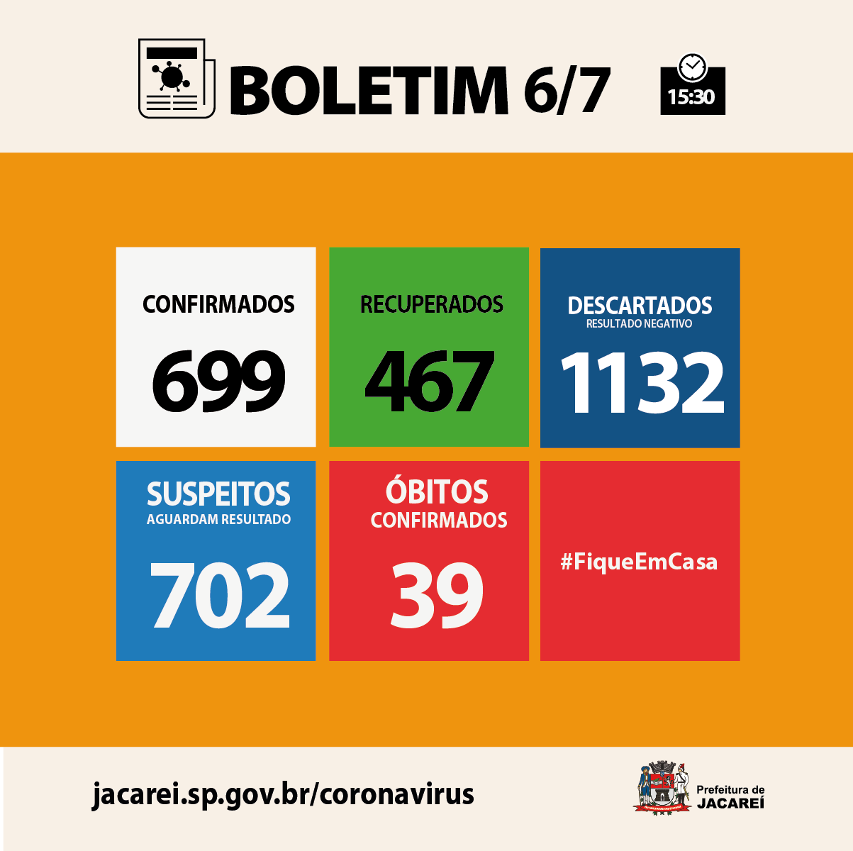 A Prefeitura de Jacareí informa, nesta segunda-feira (6), que chegou a 699 casos confirmados de COVID-19 no município (eram 647 na sexta-feira). São 380 homens e 319 mulheres. Dos confirmados, estão internados 32 (15 em hospital público – três em UTI –, e 17 em hospital privado – sendo nove em UTI). Há 161 em isolamento domiciliar. E 39 óbitos, até aqui.