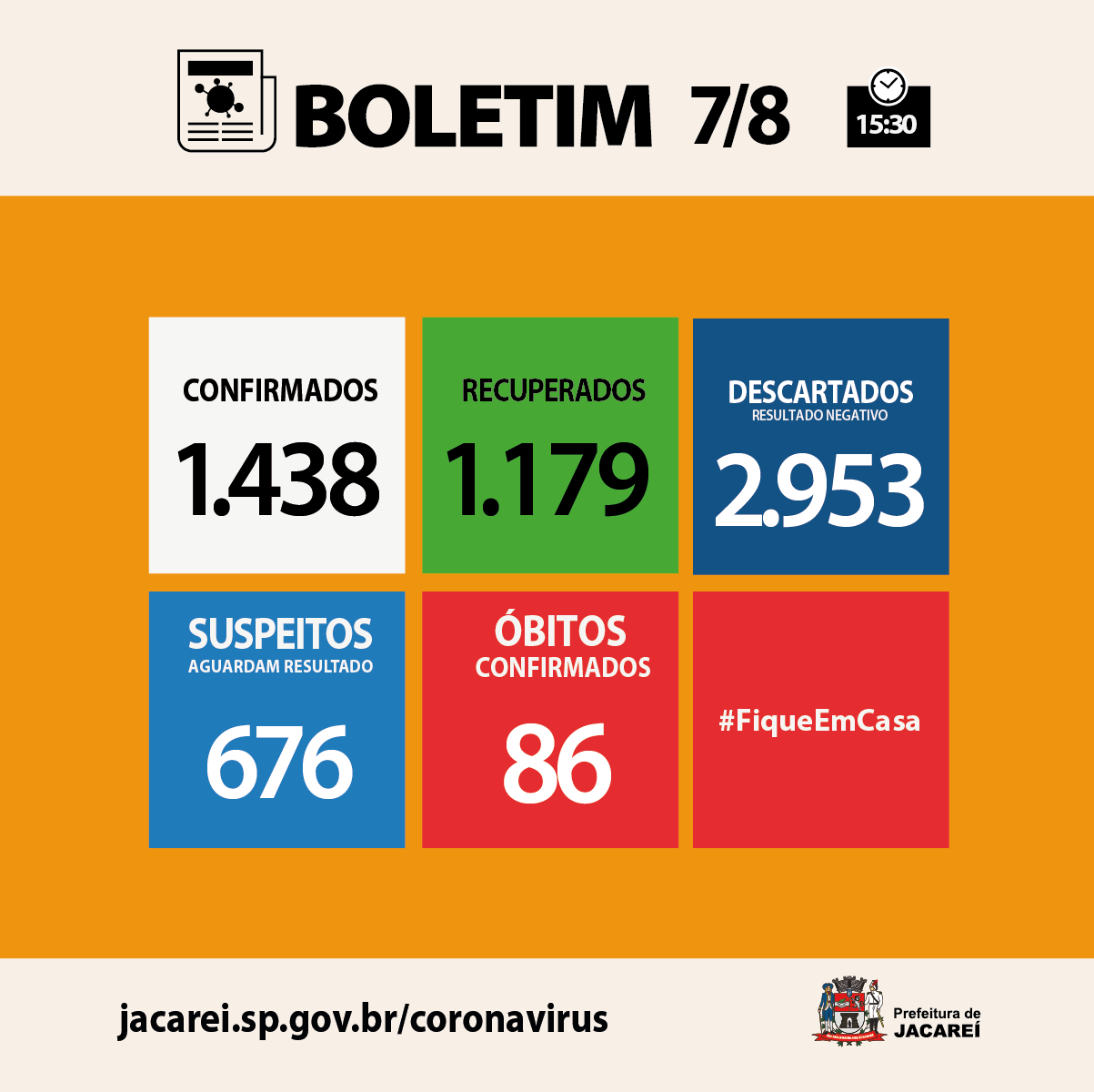 Jacareí chegou a 1438 casos confirmados da doença. São 741 homens e 697 mulheres. Dos confirmados, estão internados 25 (sete em hospital público – sendo quatro em UTI –, e 18 em hospital privado – sendo nove em UTI). Há 148 em isolamento domiciliar. E 86 óbitos, até aqui.