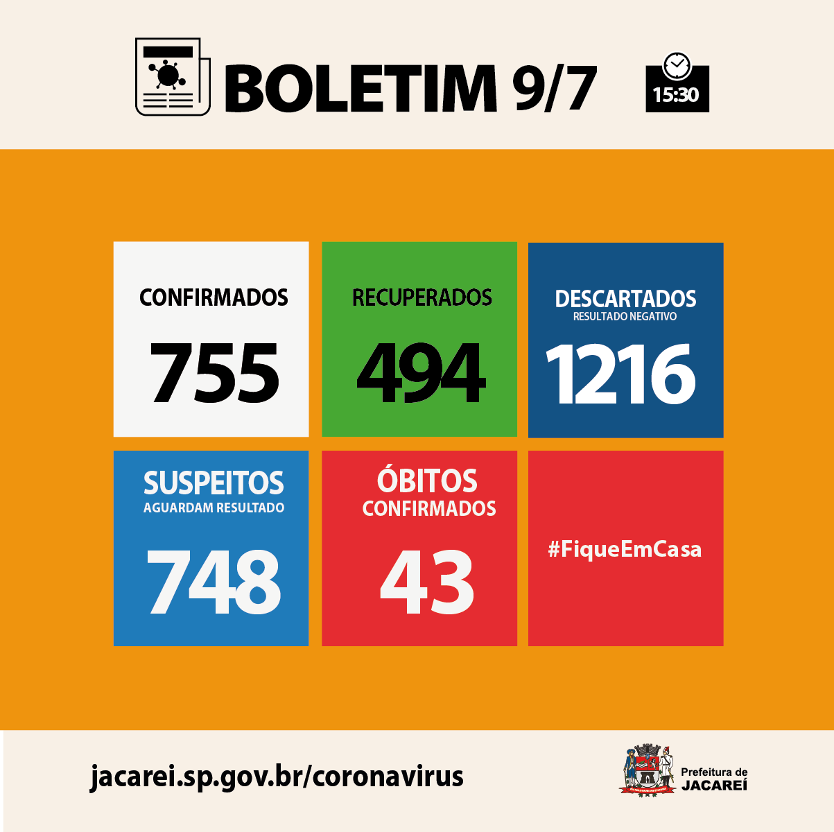Jacareí chegou a 755 casos confirmados de COVID-19 (eram 736 na quarta-feira). São 411 homens e 344 mulheres. Dos confirmados, estão internados 33 (13 em hospital público – sendo dois em UTI –, e 20 em hospital privado – sendo dez em UTI). Há 185 em isolamento domiciliar. E 43 óbitos, até aqui.