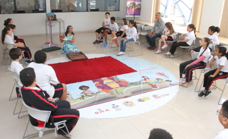 Após a contação de história, a narradora NazareLelé e o bibliotecário Robinson Mascarenhas Almeida, realizam uma breve apresentação da modernização da Biblioteca, incluindo a divulgação do catálogo on-line do acervo da Biblioteca Municipal Macedo Soares e as tecnologias que modernizam o atendimento.