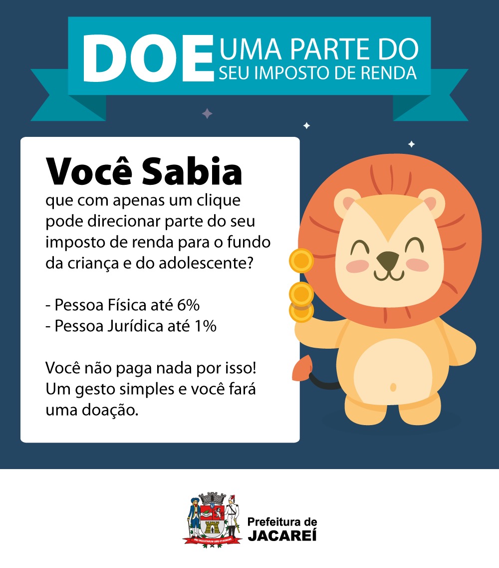 Por lei, é permitido doar até 3% do imposto devido para fundos ligados ao Estatuto da Criança e Adolescente (ECA) e mais 3% para fundos de apoio aos Conselhos do Idoso. Com a doação aos fundos municipais, o contribuinte ajudará os projetos sociais voltados às crianças e adolescentes e aos idosos do município de Jacareí, sem nenhum prejuízo ou acréscimo ao valor da declaração.