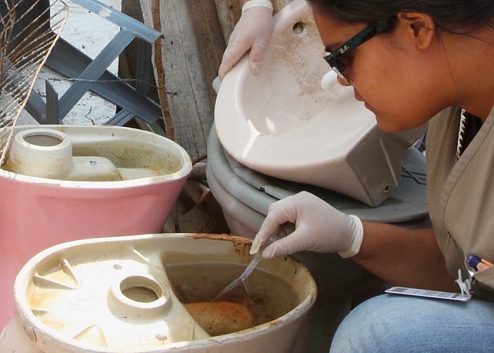 Durante a visita aos domicílios, os Agentes de Combate às Endemias examinam cuidadosamente os recipientes com potencial de se tornarem criadouros para o mosquito e os que já estão com água, realizando a coleta de amostras de larvas e pupas para análise. A ação é realizada a cada três meses.