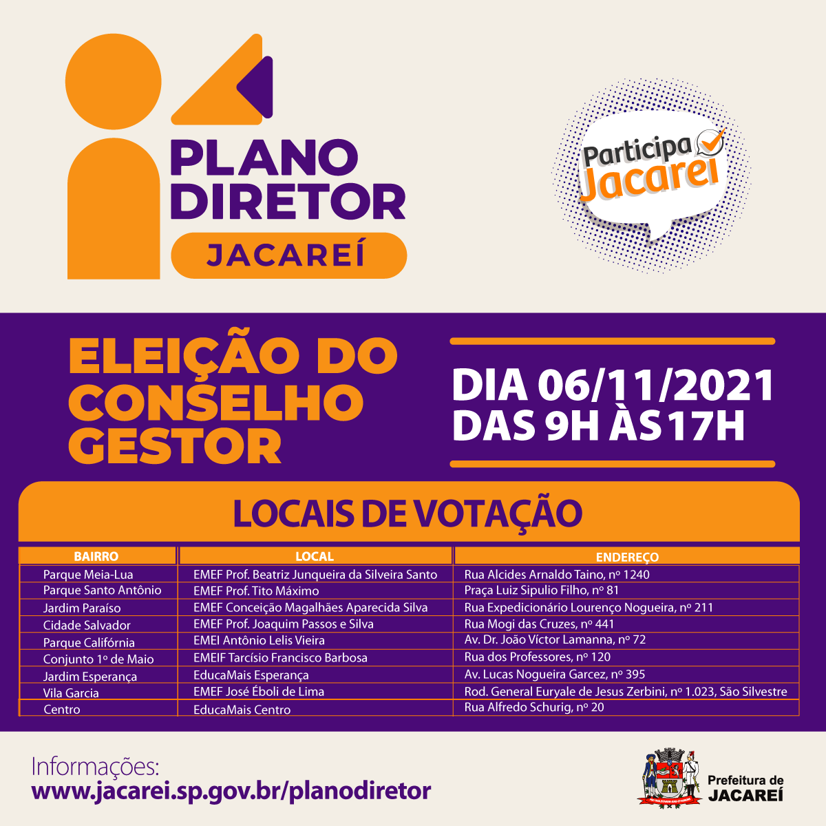 A Prefeitura de Jacareí já definiu a data e os locais de votação da eleição que irá definir os membros da sociedade civil que irão compor o Conselho Gestor que coordenará o processo de revisão do Plano Diretor do município. A eleição ocorre em 6 de novembro, das 9h às 17h, em nove postos instalados nas cinco regiões da cidade (Norte, Sul, Leste, Oeste e Centro).