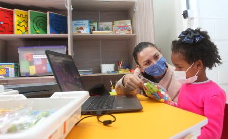 Legenda: Aluna da EMEI Biosia Lencioni, no Jardim Paraíso, já conhecendo o Lego Braille