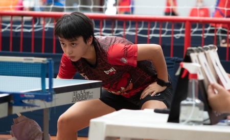 Legenda: Sofia Kano, atleta da equipe de Tênis de Mesa de Jacareí, durante campeonato