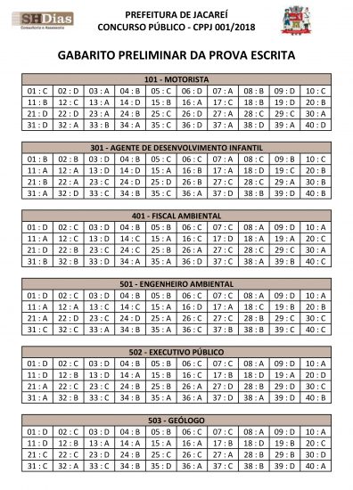 A Prefeitura de Jacareí, em vista do que consta no Edital de Concurso Público CPPJ 001/2018, torna público os Gabaritos Preliminares das Provas Escritas dos Cargos: