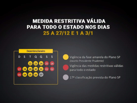 Nos dias 25 a 27 de dezembro e 01 a 03 de janeiro, apenas serviços essenciais poderão funcionar em todo o estado de São Paulo. Nos demais dias, permanecem as orientações e regras da fase amarela.