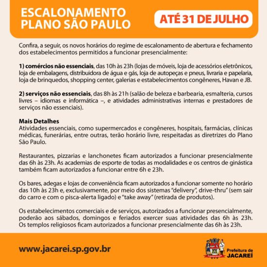 Confira, a seguir, os novos horários do regime de escalonamento de abertura e fechamento dos estabelecimentos permitidos a funcionar presencialmente: