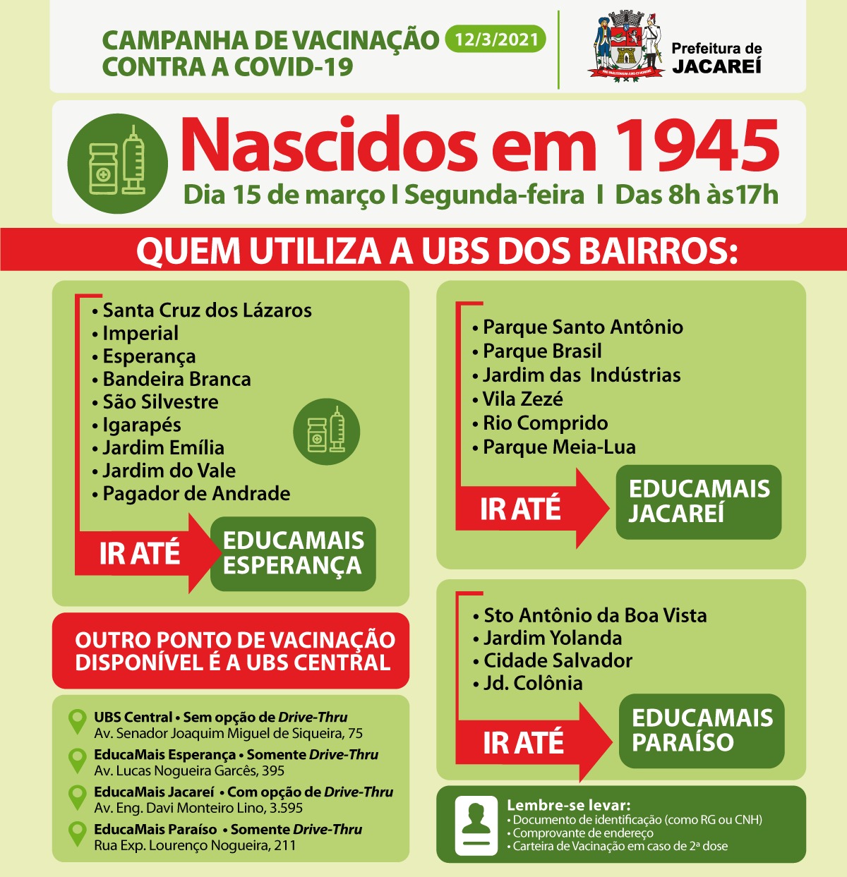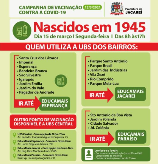 Dando sequência à Campanha de Vacinação contra a Covid-19, a Prefeitura de Jacareí, por meio da Secretaria de Saúde, irá vacinar na próxima segunda-feira (15) idosos com 76 anos, nascidos em 1945, residentes na cidade.