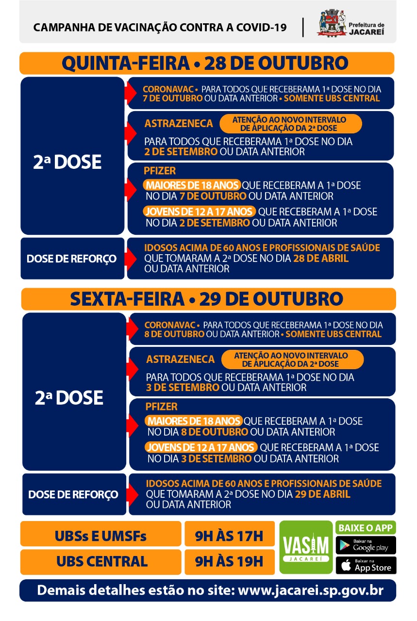 Na quinta-feira (28) e sexta-feira (29), a Prefeitura de Jacareí, por meio da Secretaria de Saúde, segue com a aplicação da segunda dose das vacinas Coronavac, AstraZeneca e Pfizer. Nestas datas, também será disponibilizada a aplicação da dose de reforço para idosos acima de 60 anos e profissionais da saúde, que tomaram a segunda dose do imunizante há mais de seis meses.