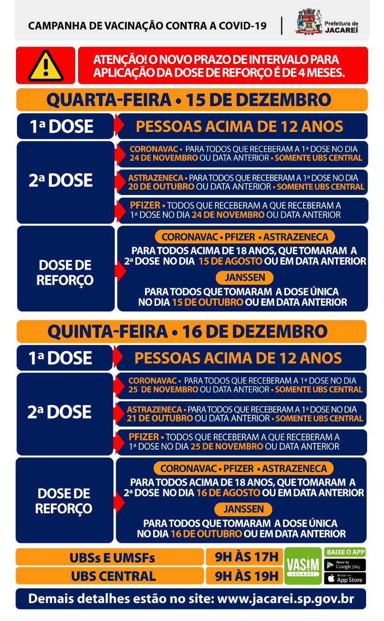 Na quarta-feira (15) e quinta-feira (16), a Prefeitura de Jacareí, por meio da Secretaria de Saúde, irá aplicar a dose de reforço para toda a população acima de 18 anos, que tenha tomado a segunda dose há mais de quatro meses, ou a dose única (Janssen) há mais de dois meses.