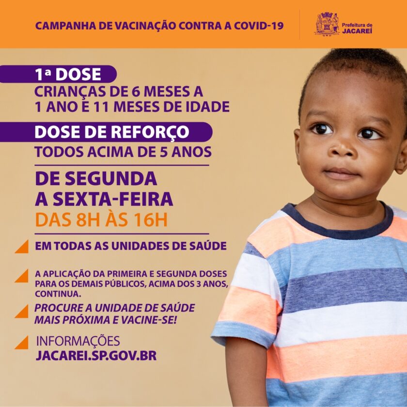 Legenda: Jacareí amplia vacinação da primeira dose contra a Covid-19 para crianças de 6 meses a 1 ano e 11 meses de idade, e da dose reforço para todos acima de 5 anos