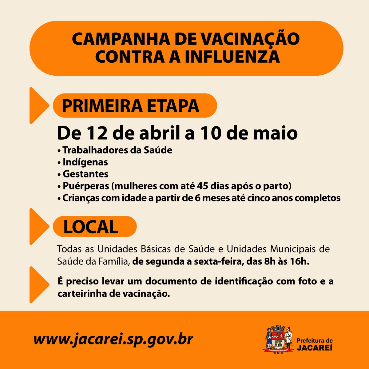 As vacinas estão sendo aplicadas em todas as Unidades Básicas de Saúde e Unidades Municipais de Saúde da Família, de segunda a sexta-feira, das 8h às 16h. É preciso levar um documento de identificação com foto e a carteirinha de vacinação.