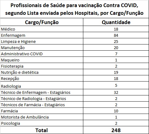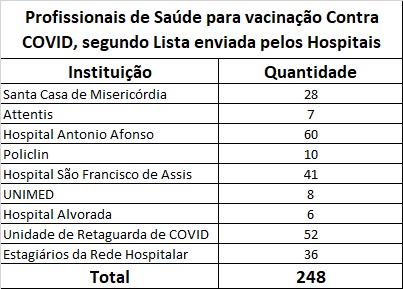 A lista de profissionais que se enquadram nos requisitos para receber a primeira dose do imunizante, nesta etapa, foi enviada pelos próprios hospitais à Secretaria de Saúde. Não serão vacinados profissionais que estiverem fora da lista. A Prefeitura recebeu 300 doses para o público-alvo aqui citado.
