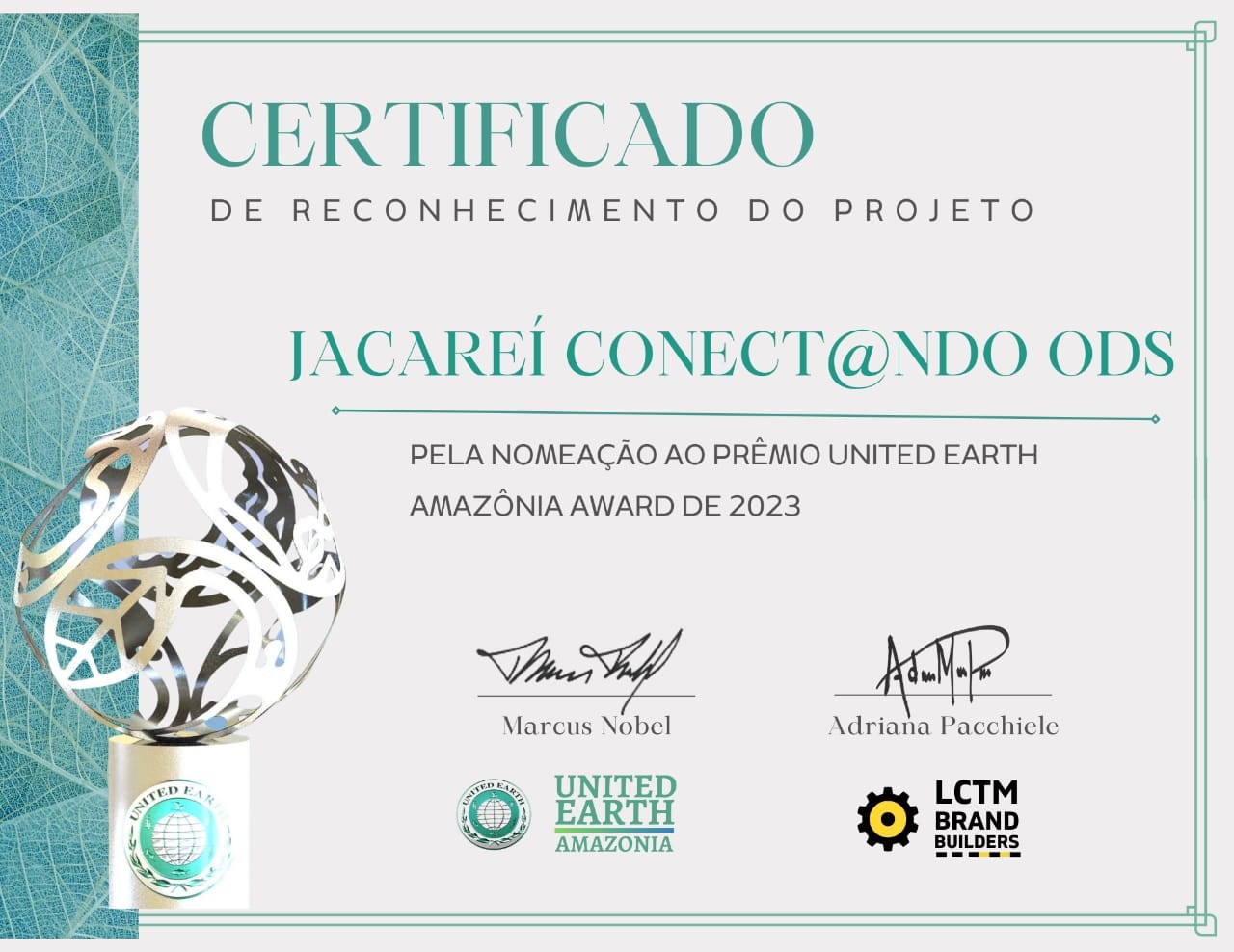 O projeto Jacareí Conect@ndo ODS ficou entre os 22 finalistas classificados no Certificado de Reconhecimento do Prêmio United Earth Amazônia Award. “Foi um evento incrível. De Jacareí para a Amazônia, neste prêmio considerado o Nobel Verde”, destacou a secretária municipal de Educação Maria Thereza Ferreira Cyrino, que esteve presente a solenidade, em Manaus, na última segunda-feira (27).