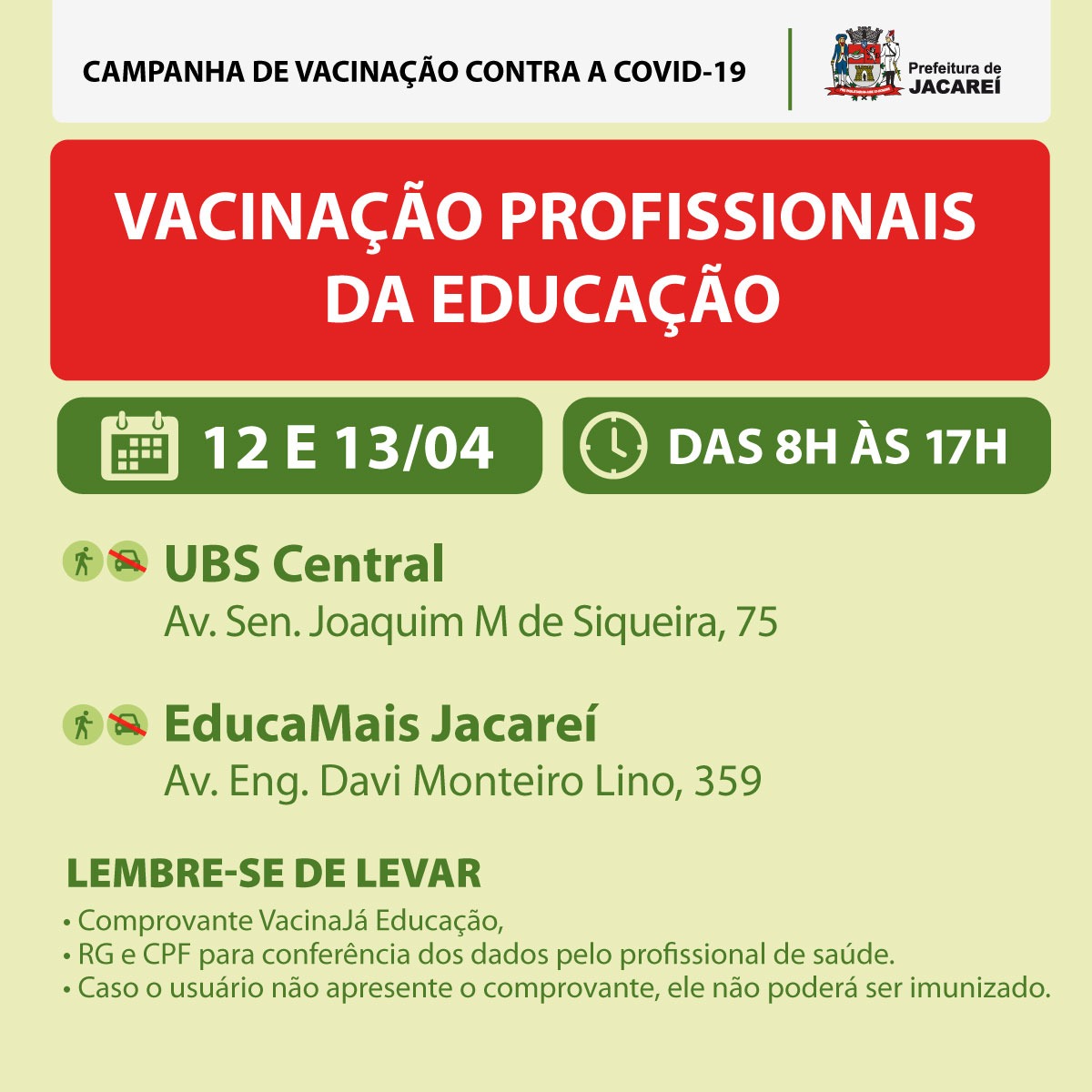 Os profissionais da educação poderão se vacinar, das 8h às 17h, em dois locais de vacinação: EducaMais Jacareí e UBS Central.