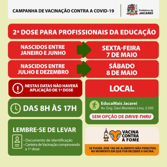 A Secretaria de Saúde fez a divisão por mês de nascimento para evitar aglomerações. Os profissionais desta categoria receberam a primeira dose do imunizante nos dias 12 e 13 de abril. A segunda dose deve ser administrada até 28 dias após a aplicação da primeira.