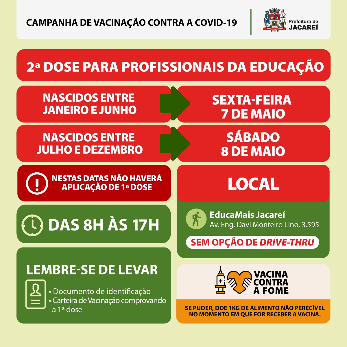 Na sexta-feira (7), poderão receber a segunda dose da vacina todos os profissionais da Educação nascidos entre os meses de janeiro e junho.