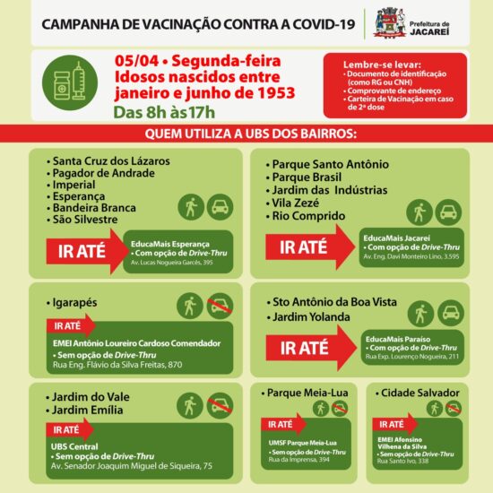 Estes idosos poderão tomar a primeira dose da vacina em sete locais diferentes da cidade: EducaMais Jacareí, UBS Central, EducaMais Esperança, EducaMais Paraíso, UMSF do Parque Meia-Lua, EMEI Afonsino Vilhena da Silva (Cidade Salvador) e EMEI Antônio Loureiro Cardoso Comendador (Igarapés). A recomendação é que o idoso se dirija ao local mais próximo de sua residência.