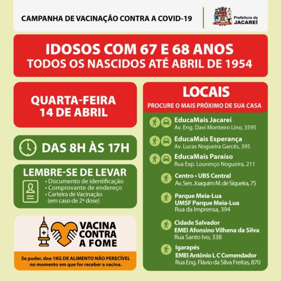 A cidade retoma a aplicação da primeira dose do imunizante em idosos nesta quarta-feira (14). Poderão receber a vacina contra a Covid-19 aqueles nascidos entre julho e dezembro de 1953 (68 anos) e os nascidos até o mês de abril 1954 (67 anos), residentes em Jacareí.