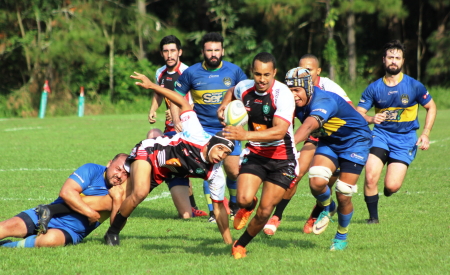 Legenda: Eliel Silva, do Jacareí Rugby, com a bola em jogo na estreia do Paulista
