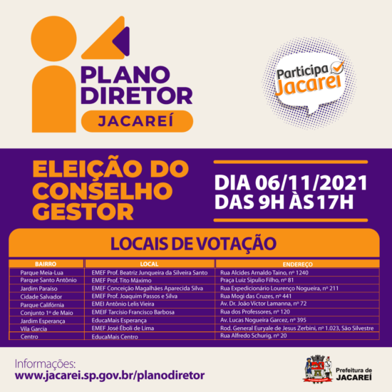O município de Jacareí se prepara para retomar a revisão do seu Plano Diretor, com a eleição dos membros da sociedade civil que irão integrar o Conselho Gestor que irá coordenar todo o processo de discussão junto à população. Esta eleição ocorrerá no dia 6 de novembro, em nove postos de votação espalhados por todas regiões da cidade, das 9h às 17h. Poderão votar todos os eleitores inscritos nas sessões eleitorais de Jacareí, bastando apresentar título de eleitor ou documento de identificação.