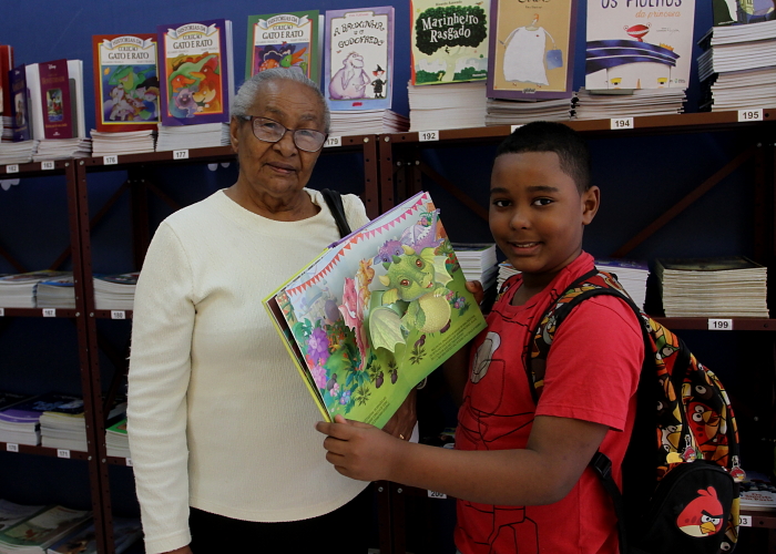 Já Maria Emília Bispo de Jesus Dias, moradora do Santo Antônio da Boa Vista, trouxe seu neto Vinicius, de oito anos, aluno do terceiro ano da EMEF Verano Câmara, para pegar seu livro. Disse: “Tudo muito lindo. Amei. Deixei de fazer almoço para estar aqui. Está tudo maravilhoso”. Vinicius falou que gosta muito de ler. “O livro é pra gente aprender a ler e estudar. Gosto das imagens e escolhi o livro “Dança de Dragão”.
