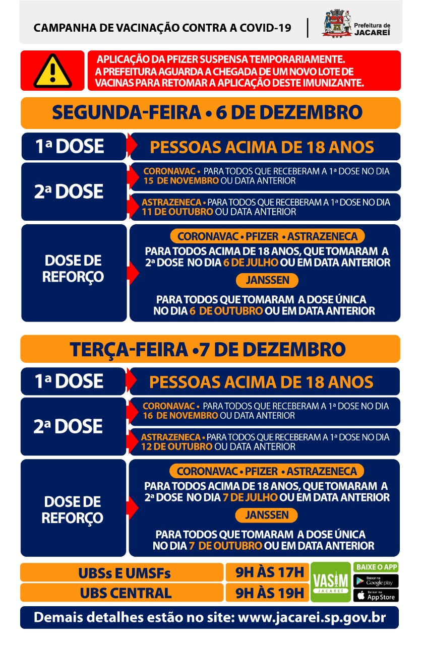 Na segunda-feira (6) e terça-feira (7), a Prefeitura de Jacareí, por meio da Secretaria de Saúde, irá aplicar a dose de reforço para toda a população acima de 18 anos, que tenha tomado a segunda dose há mais de cinco meses, ou a dose única (Janssen) há mais de dois meses.