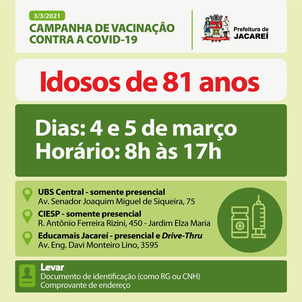 Dando sequência à Campanha de Vacinação contra a Covid-19, a Prefeitura de Jacareí, por meio da Secretaria de Saúde, inicia nesta quinta-feira (4) a imunização dos idosos com 81 anos residentes na cidade.