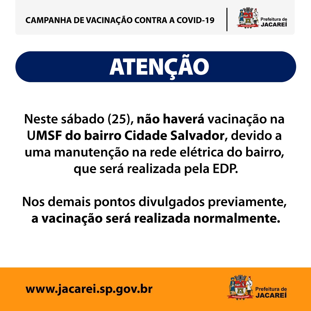 O atendimento, no sábado (25), para primeira e segunda dose, será feito das 8h às 17h em todas as Unidades Municipais de Saúde da Família (exceto Pagador Andrade e Cidade Salvador), Unidades Básicas de Saúde e UBS Central. Confira os endereços das Unidades de Saúde de Jacareí clicando aqui.
