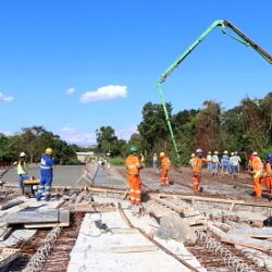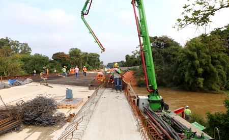 No início de maio, foi iniciada a concretagem das lajes que compõem o tabuleiro da ponte, que será executado por trechos. No momento, o tabuleiro encontra-se com mais de 50% concretado. Para as próximas semanas, estão previstas a finalização da concretagem da laje e a instalação de guarda corpos e barreiras de divisa da pista (‘Barreira New Jersey’).